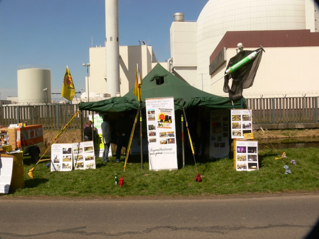Rund 2500 Menschen kamen zeitgleich in Grafenrheinfeld zusammen. Darunter viele Menschen mit Fahrrad, Transparenten und Fahnen. Auch hier gab es neben Reden, zahlreiche kulturelle Angebote für Kinder und Erwachsene. Des Weiteren haben am gleichen Tag – teils angekettet – AktivistInnen gegen den Einbau von plutoniumhaltigen Mox-Brennelementen die Hauptzufahrt zum Atomkraftwerk Grohnde blockiert.