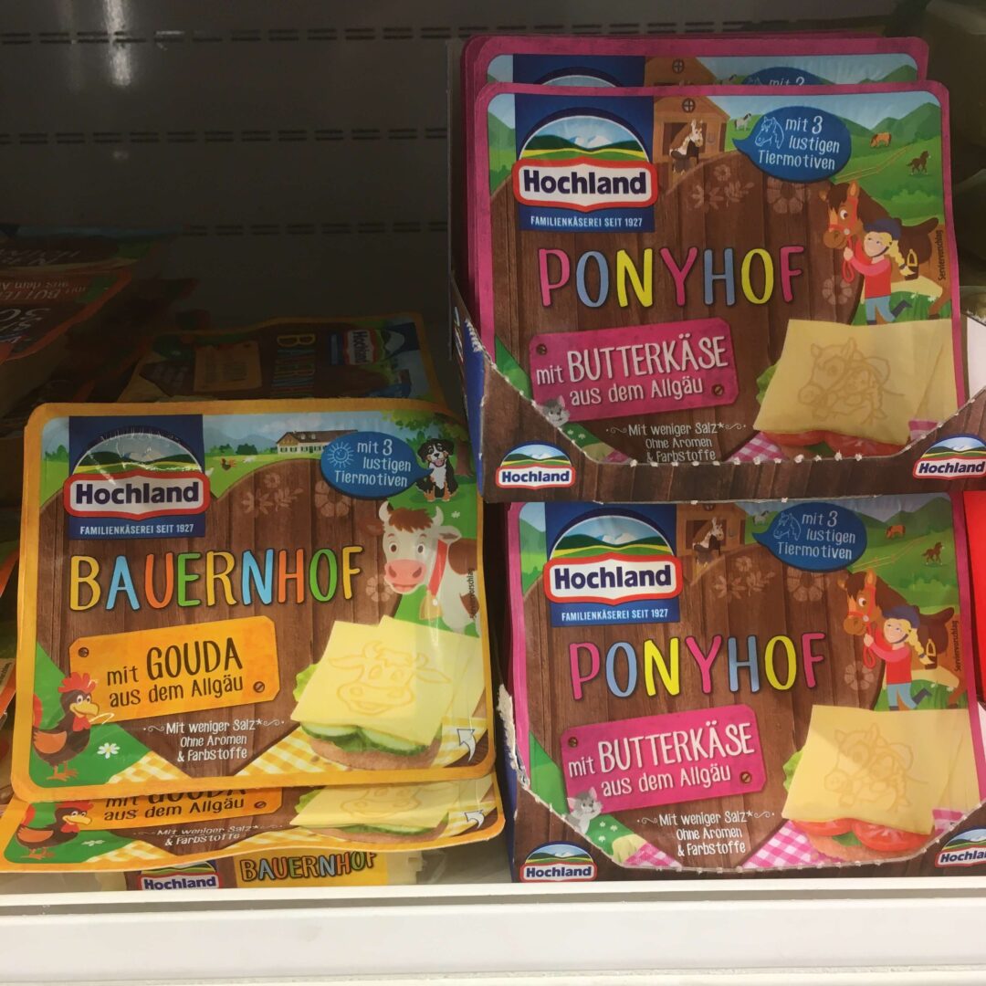 Die Hersteller tierischer Lebensmittel geben sich größte Mühe, uns auf Produktverpackungen im Supermarkt weiterhin das Märchen einer heilen Welt zu erzählen. Die glücklich-grasende Kuh auf dem Milchkarton ist wohl das Paradebeispiel dafür, wie weit Marketing und Realität in den Ställen auseinanderdriften. Bei Gesichtsmortadella, Bärchenwurst, Knusperdinos, einer Kuh mit Sonnenbrille, Ferdi Fuchs Mini-Würstchen und Co. müssen vermutlich selbst die überzeugtesten Fleischesser:innen so manches Mal mit dem Kopf schütteln und doch sind die Kühlregale voll davon. Kinder lieben es, Eltern zahlen gerne den überteuerten Preis für ein obendrein ungesundes Produkt. So werden schon die Kleinsten früh auf verniedlichte Weise darauf trainiert, Fleisch und Milch als etwas Selbstverständliches zu betrachten und hinterfragen nicht, woher das eigentlich wirklich stammt.